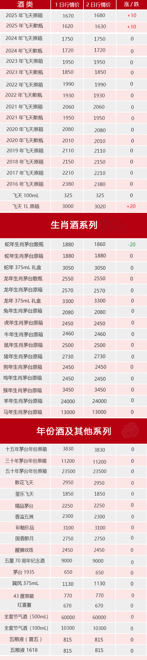 以2025年份的53度500ml飛天茅臺為例,其批發(fā)價在年初(1月份)時,散瓶價格約為2220元/瓶,原箱價格約為2255元/瓶。而到了11月初,散瓶批發(fā)價已降至1630元/瓶,原箱價格也跌至1680元/瓶。僅在這10個月內(nèi),散瓶價格的跌幅就超過了25%。