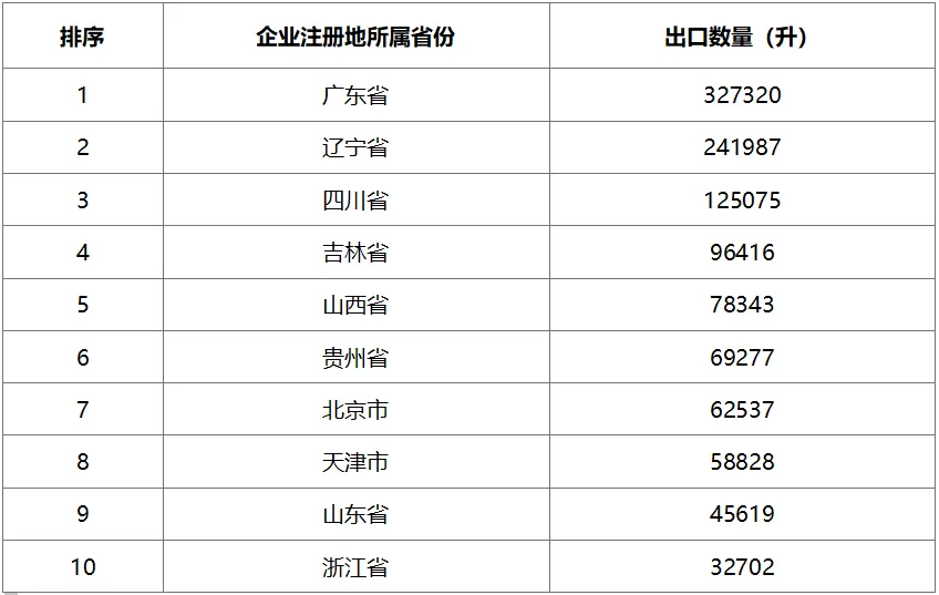2024年6月白酒主要出口省市按數(shù)量排序