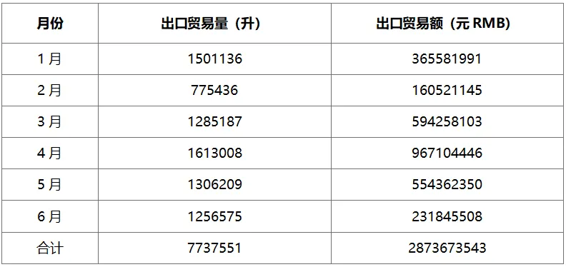 2024年1-6月白酒出口貿(mào)易量額
