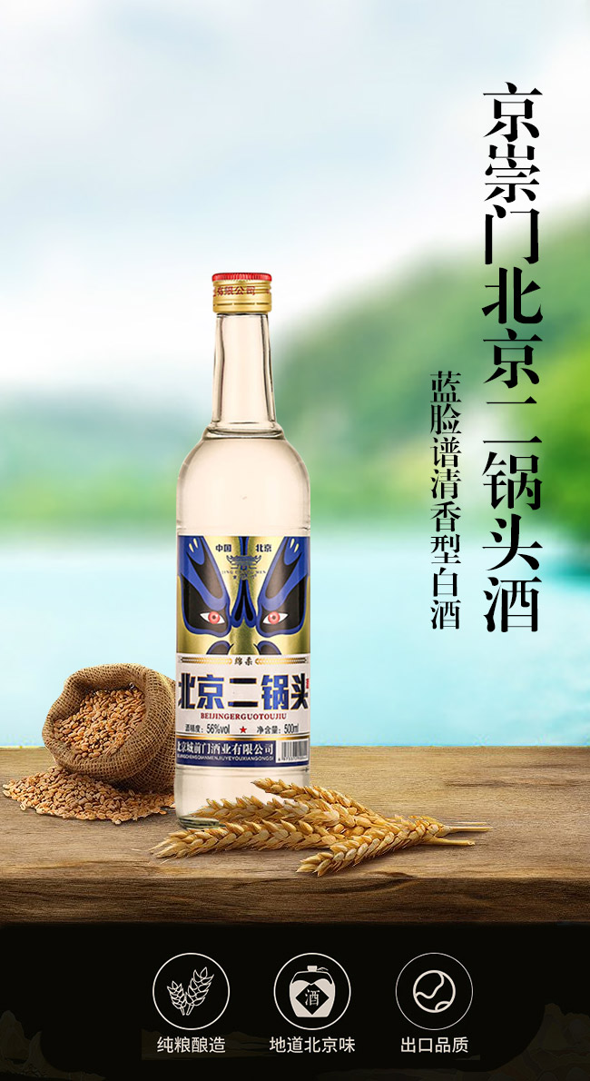 產(chǎn)品名:京崇門北京二鍋頭酒藍臉譜清香型白酒【42°56°500ml】