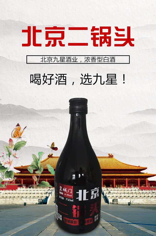 北京九星酒業(yè)有限公司是一家集產(chǎn)品研發(fā),生產(chǎn)銷售為一體的現(xiàn)代化白酒規(guī)模企業(yè)。目前開發(fā)的主要是皇城門系列白酒產(chǎn)品。是以優(yōu)質(zhì)高粱為主要原料,用大麥、小麥、豌豆制成大曲,輔多種微生物為糖化酵劑,再經(jīng)過長期發(fā)酵,緩慢蒸餾,取之精華,經(jīng)多年陳貯后,精心勾兌而成。以“清香幽雅,醇厚綿甜,尾昧爽凈”的獨特風(fēng)格,深受各界朋友的青睞。