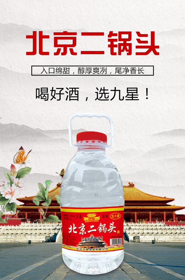 北京九星酒業(yè)有限公司是一家集產(chǎn)品研發(fā),生產(chǎn)銷售為一體的現(xiàn)代化白酒規(guī)模企業(yè)。目前開發(fā)的主要是皇城門系列白酒產(chǎn)品。是以優(yōu)質高粱為主要原料,用大麥、小麥、豌豆制成大曲,輔多種微生物為糖化酵劑,再經(jīng)過長期發(fā)酵,緩慢蒸餾,取之精華,經(jīng)多年陳貯后,精心勾兌而成。以“清香幽雅,醇厚綿甜,尾昧爽凈”的獨特風格,深受各界朋友的青睞。