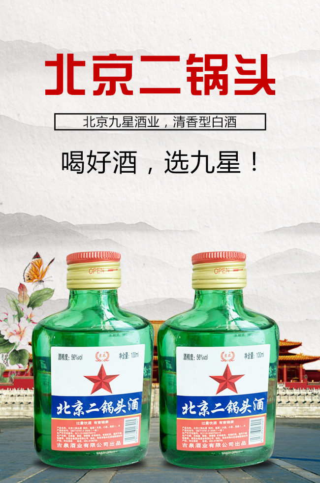 產(chǎn)品名:京恭北京二鍋頭酒綠瓶56°100m清香型白酒