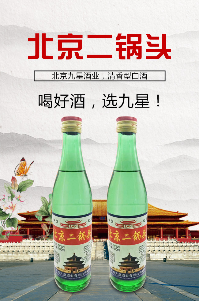產(chǎn)品名:皇城門北京二鍋頭酒綠瓶56°500ml清香型白酒