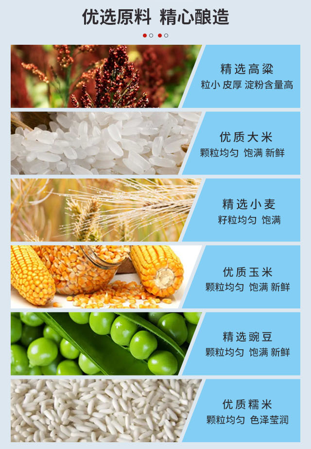 原料:高粱、大米、玉米、小麥、糯米、豌豆等