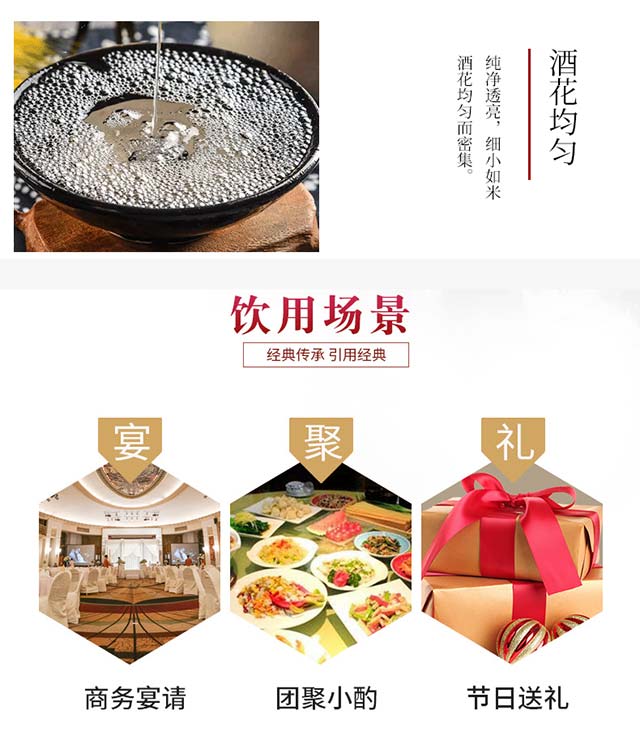 適飲場合:商務(wù)宴會、團(tuán)圓小酌、婚慶宴席、節(jié)日送禮、收藏等