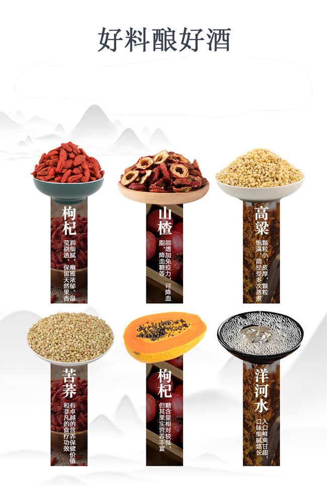 多糧白酒風(fēng)味物質(zhì)多樣,酯類等香氣物質(zhì)豐富,以高梁、黑蕎麥、特產(chǎn)枸杞、紅山楂。洋河水和木瓜為原料經(jīng)陳年老窖發(fā)酵調(diào)制而成。