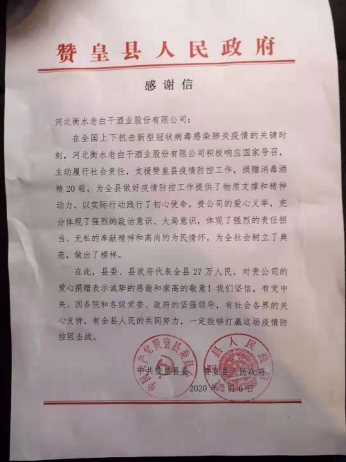 衡水老白干此舉及時解決了河北當?shù)氐奈镔Y短缺問題,河北省各市、縣區(qū)發(fā)來感謝信表揚衡水老白干以實際行動踐行了企業(yè)的初心與使命,企業(yè)的愛心義舉體驗出強烈的責任擔當,無私奉獻精神和高尚的為民情懷,做出了榜樣!