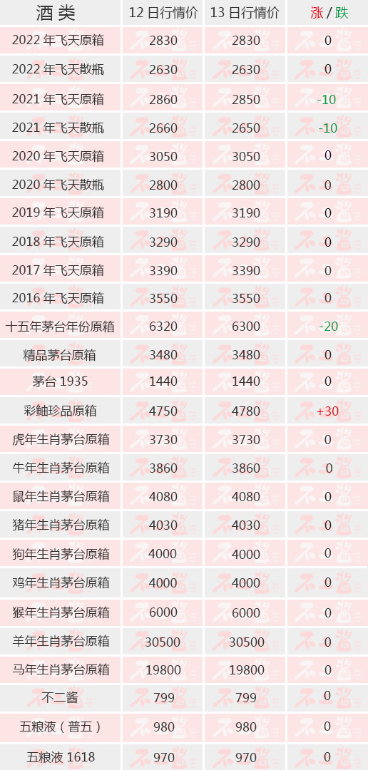 4月13日茅臺酒行情價總體維持穩(wěn)價。飛天方面,2021年原箱及散瓶均有10元/瓶的小幅跌價。生肖方面價格與昨日持平,連跌6日的虎茅在今天迎來了短暫喘息。其他系列中,十五年跌價20元/瓶,彩釉珍品有30元/瓶的漲幅。