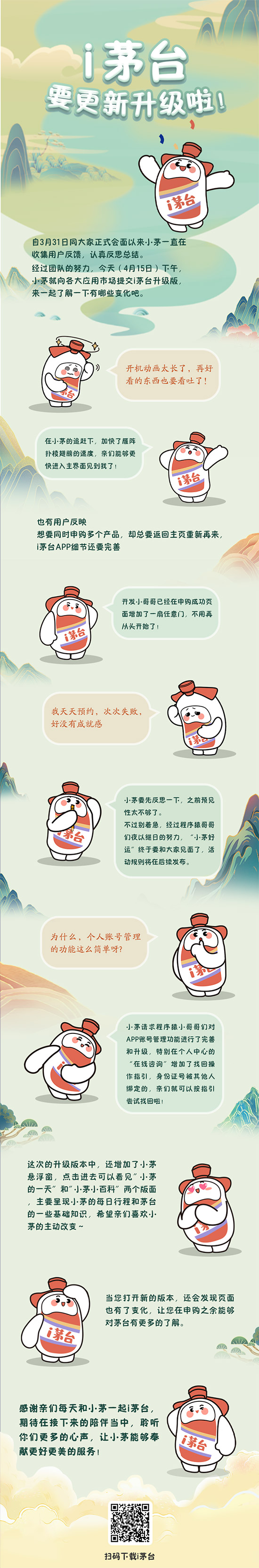 4月15日i茅臺官微發(fā)布消息將更新升級,增加“小茅好運”,縮短開機動畫,完善升級個人賬號管理等。