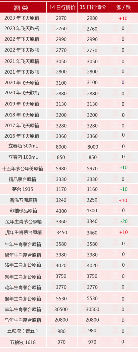 3月15日茅臺(tái)酒行情價(jià),立春酒終于止住了漲勢(shì)。飛天方面,2023年原箱漲10元/瓶;生肖方面,兔年跌價(jià)20元/瓶,虎年漲10元/瓶;其他系列,十五年,精品茅臺(tái)、茅臺(tái)1935小跌10元/瓶,香溢五洲漲10元/瓶。
