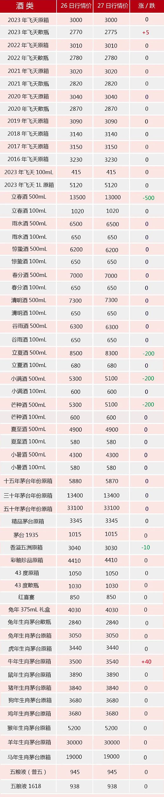 8月27日茅臺(tái)酒行情價(jià)新增兩款節(jié)氣酒,大夏至和小暑價(jià)格分別是4900、4300元/瓶,小夏至和小暑酒價(jià)格為580元/瓶。飛天方面,2023年飛天原箱漲5元/瓶;生肖方面,牛年原箱漲40元/瓶;其他系列,香溢五洲跌10元/瓶,多款大節(jié)氣酒跌200-500元/瓶。
