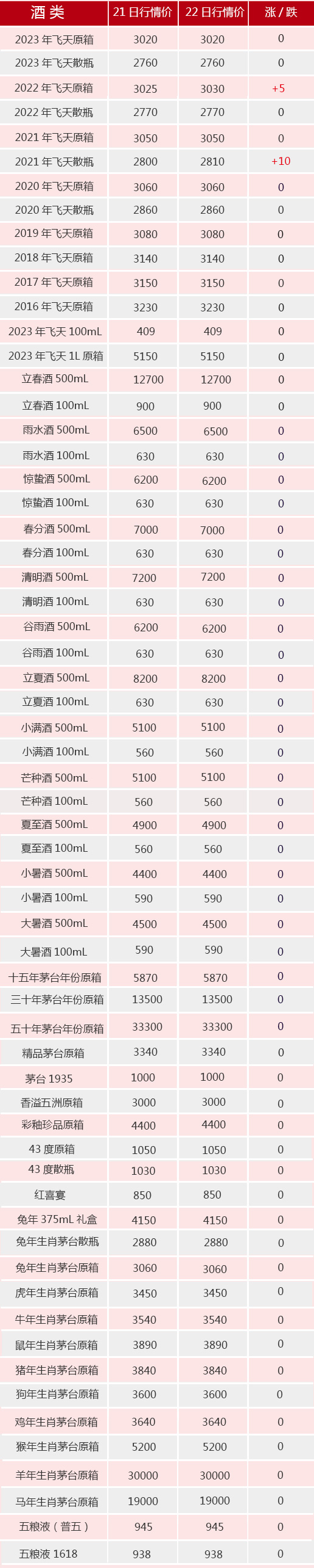 9月22日茅臺(tái)行情價(jià)。飛天方面,2022年原箱和2021年散瓶漲5~10元/瓶;生肖方面和其他系列無(wú)動(dòng)價(jià)。
